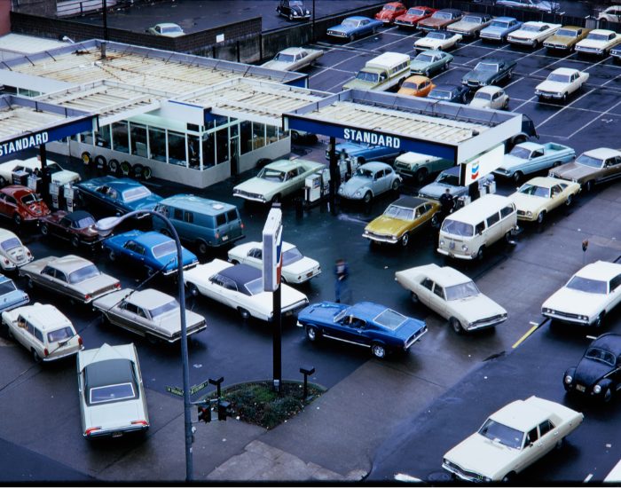 Bird’s eye view of an average gas station during the early morning hours during gas rationing. National Archives photo 555457