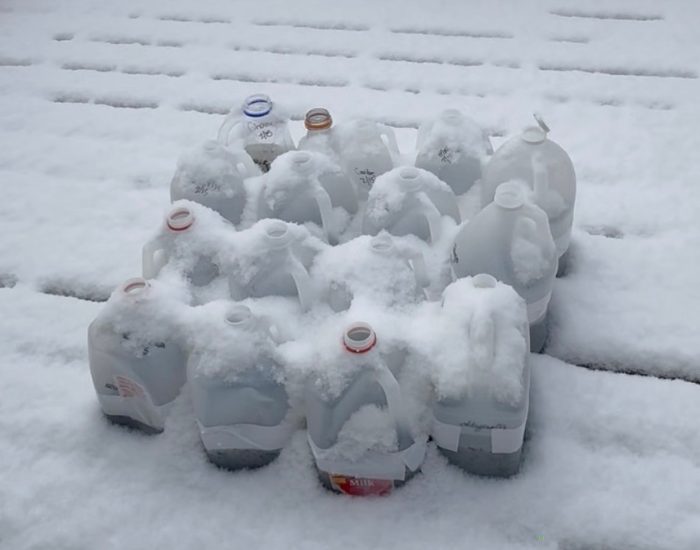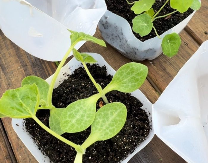 Seeds germinate outdoors in recycled milk jugs.